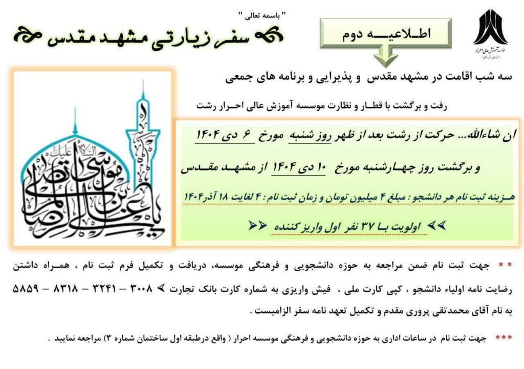 قابل توجه خواهران دانشجوی متقاضی سفر مشهد مقدس دی ماه 1404 :
