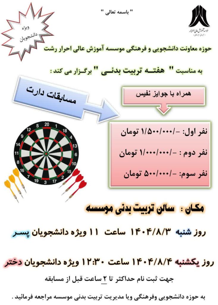 مسابقات پرتاب دارت به مناسبت هفته تربیت بدنی دیدگاه خود را بنویسید / اخبار, اطلاعیه ها, اطلاعیه های فرهنگی و دانشجویی