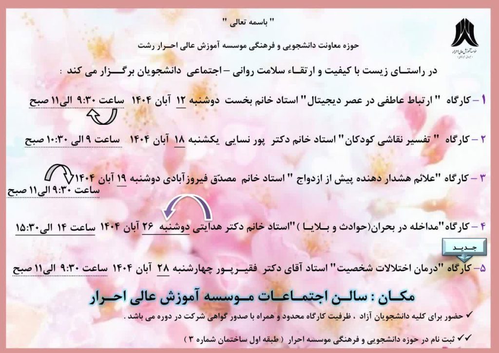در راستای زیست با کیفیت و ارتقای سلامت روانی – اجتماعی دانشجویان ، حوزه معاونت دانشجویی و فرهنگی موسسه احرار برگزار میکند.